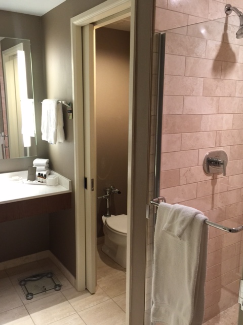 The modern bathroom was clean and spacious with a walk-in shower and a granite vanity. Kudos for the great water pressure and the small foot rest perfect for leg shaving.