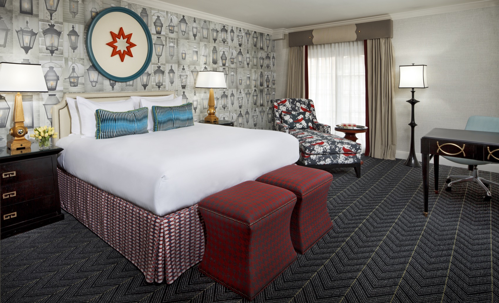 The hotel boasts 241 suites and guestrooms, including two-level loft suites, 28 terrace rooms with balconies, an 800-square-foot Mediterranean Suite plus the brand-new Eleanor Suite, perfect for wedding day prep. The guestrooms are playful yet sophisticated with subtle hints to the hotel’s location and storied Civil War past. Geometric carpet, cheery accent pillows, studded cream-colored headboards, new ergonomic teal chairs and graphic collages of flickering gas lamps adorn each room.